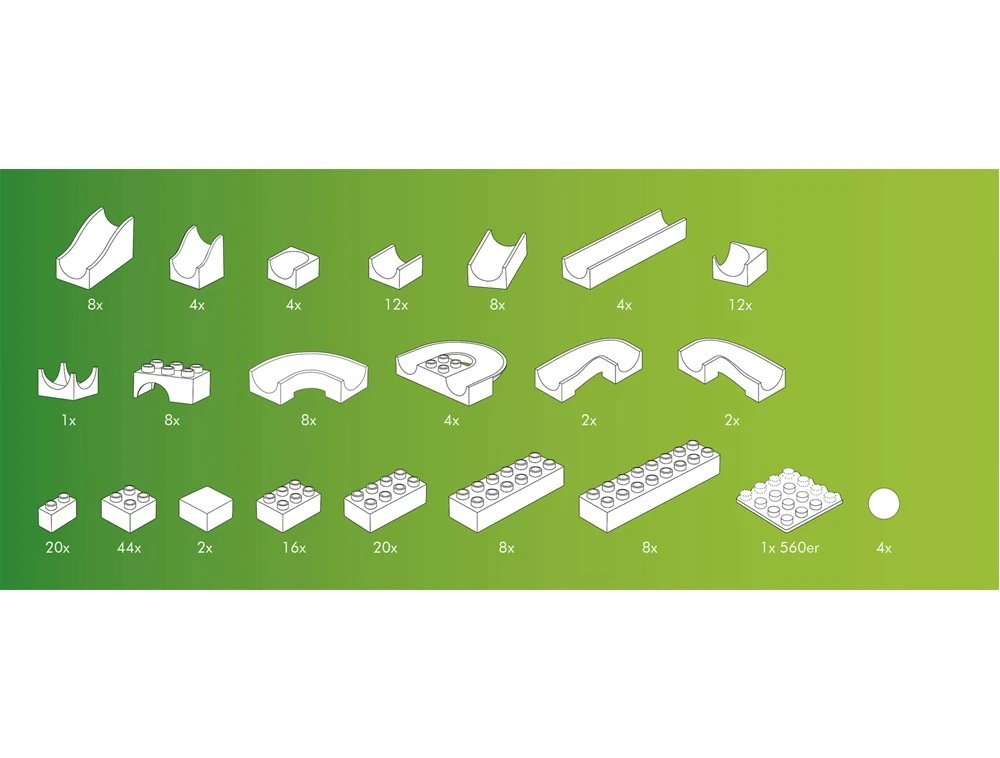 De basisdoos is perfect voor beginnende knikkerbaanontdekkers. Die bevat alles wat nodig is om spectaculaire knikkerbanen te kunnen bouwen: twee grondplaten, heel veel baanelementen, witte constructiebouwstenen, knikkers en natuurlijk een uitgebreid geïllustreerde handleiding. 106-delige set biedt oneindig veel mogelijkheden voor oneindig veel plezier.