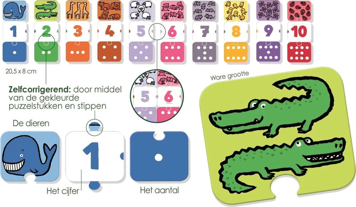 Met ‘Ik Leer Cijfers’ leren kinderen spelenderwijs cijfers herkennen, tellen, hoeveelheden ordenen en verbanden leggen. Leer met behulp van de 6 spelletjes tellen van 1 tot 10. Om alleen of samen mee te spelen. Leg de dierenreeks van klein naar groot. Zie jij hoeveel dieren er op de kaart staan? Puzzel dan het juiste getal eraan vast. De spelletjes lopen op in moeilijkheidsgraad en zijn zelfcorrigerend.